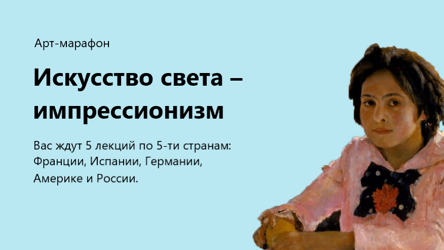 Вас ждут 5 лекций по 1,5 ч посвященных искусству импрессионизма в 5 странах: Франции, Испании, Германии, Америке и России.